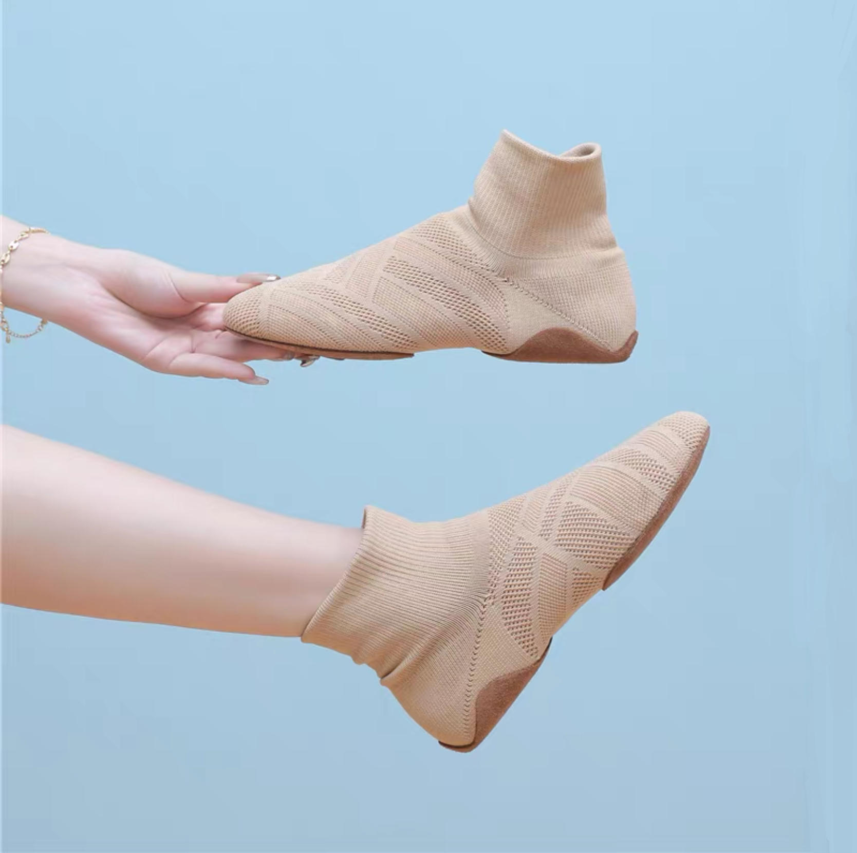 Feather-light and second-skin soft: stretchy, breathable flyknit upper hugs your foot like a sock, while the thin, flexible anti-slip rubber sole keeps just enough grip for dance floors, yoga, or casual walks—yet stays thin enough to retain real ground feel and natural movement.