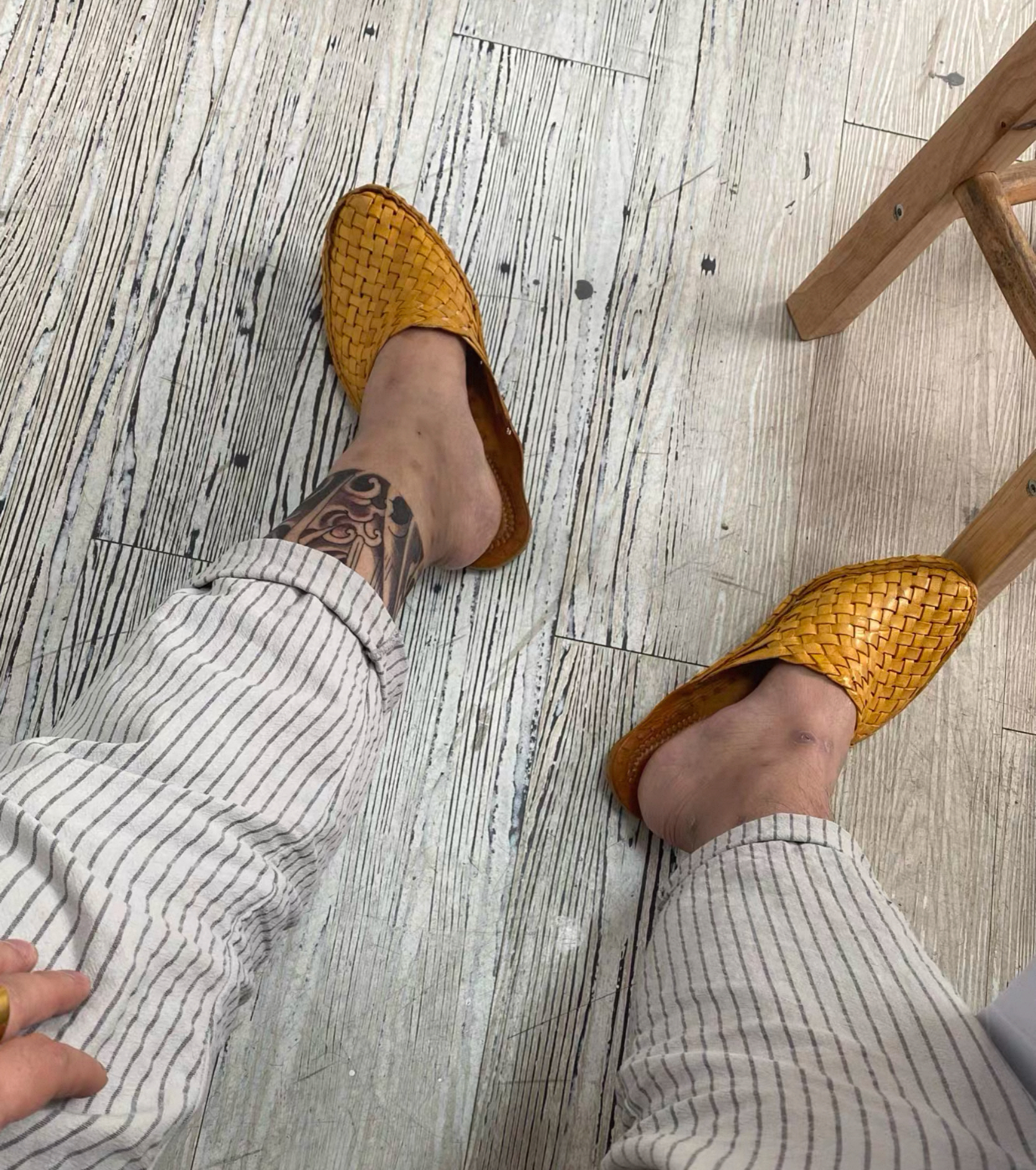 The inside of the shoes may stain initially!! This is because new shoes are dyed with plant-based dyes and don’t have chemical color-fixing properties; it will dissipate after a few days. Please don’t wear white socks with them~ Newly made shoes are really stiff!! But they’ll become more comfortable the more you wear them~